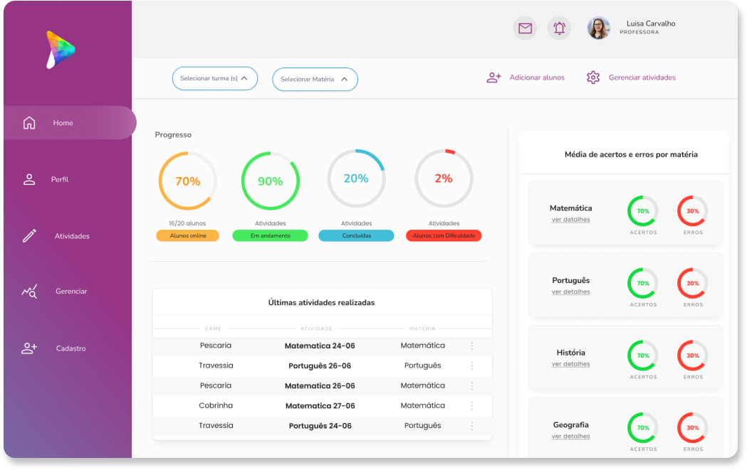 Com o tecnológico painel de controle, o professor pode personalizar as questões e acompanhar cadastrando instruções únicas para cada aluno baseado em suas dificuldades.